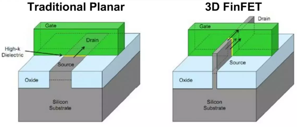 5. FinFET : 기존의 Planar FET은 gate의 한 면을 통해서만 channel을 통제하였다. 소자가 작아지며 gate로 소자를 control하기 힘들어졌고, 이에 FinFET이 등장했다. FinFET은 channel의 3면을 gate가 감싸는 구조로써 channel width가 w에서 2h+w로 증가한다. 즉 gate에 의한 control이 쉬워진다.